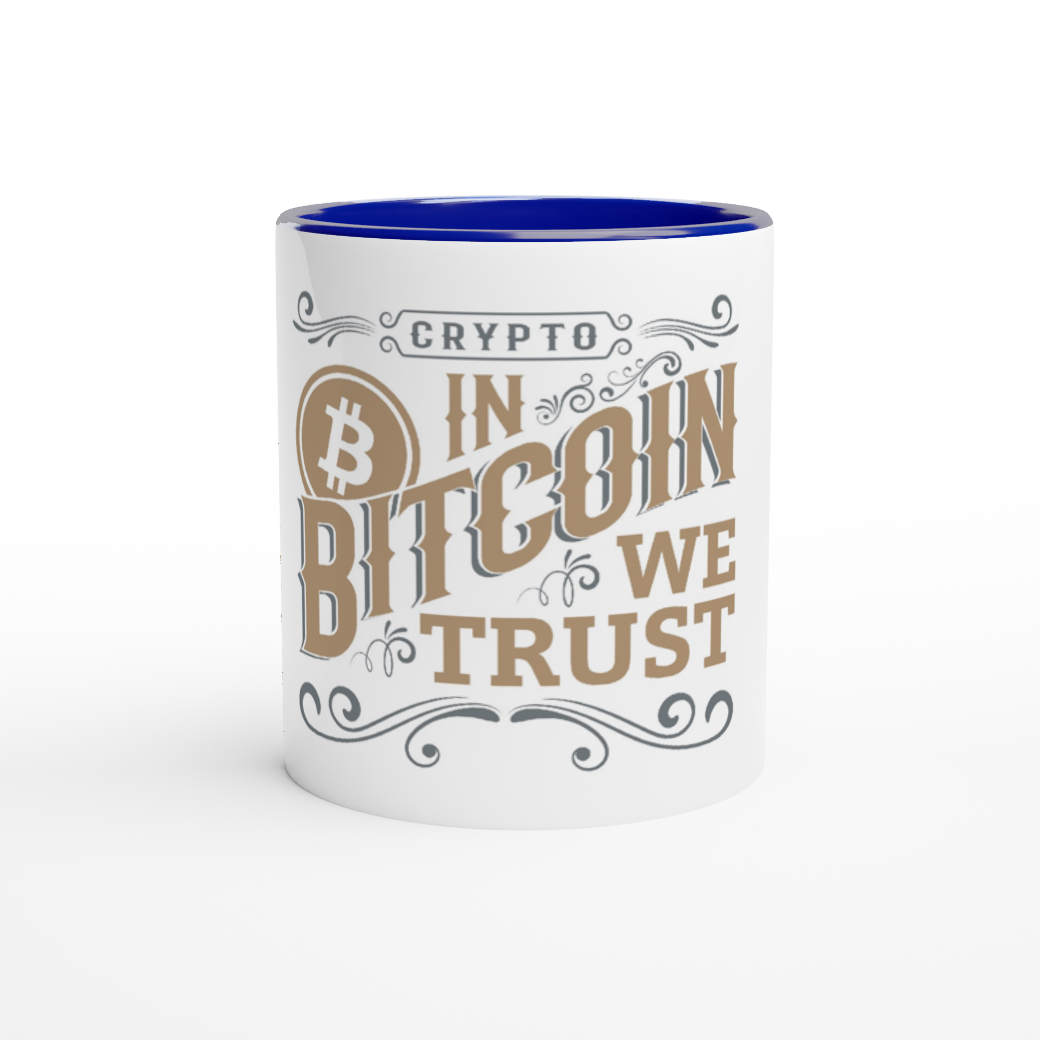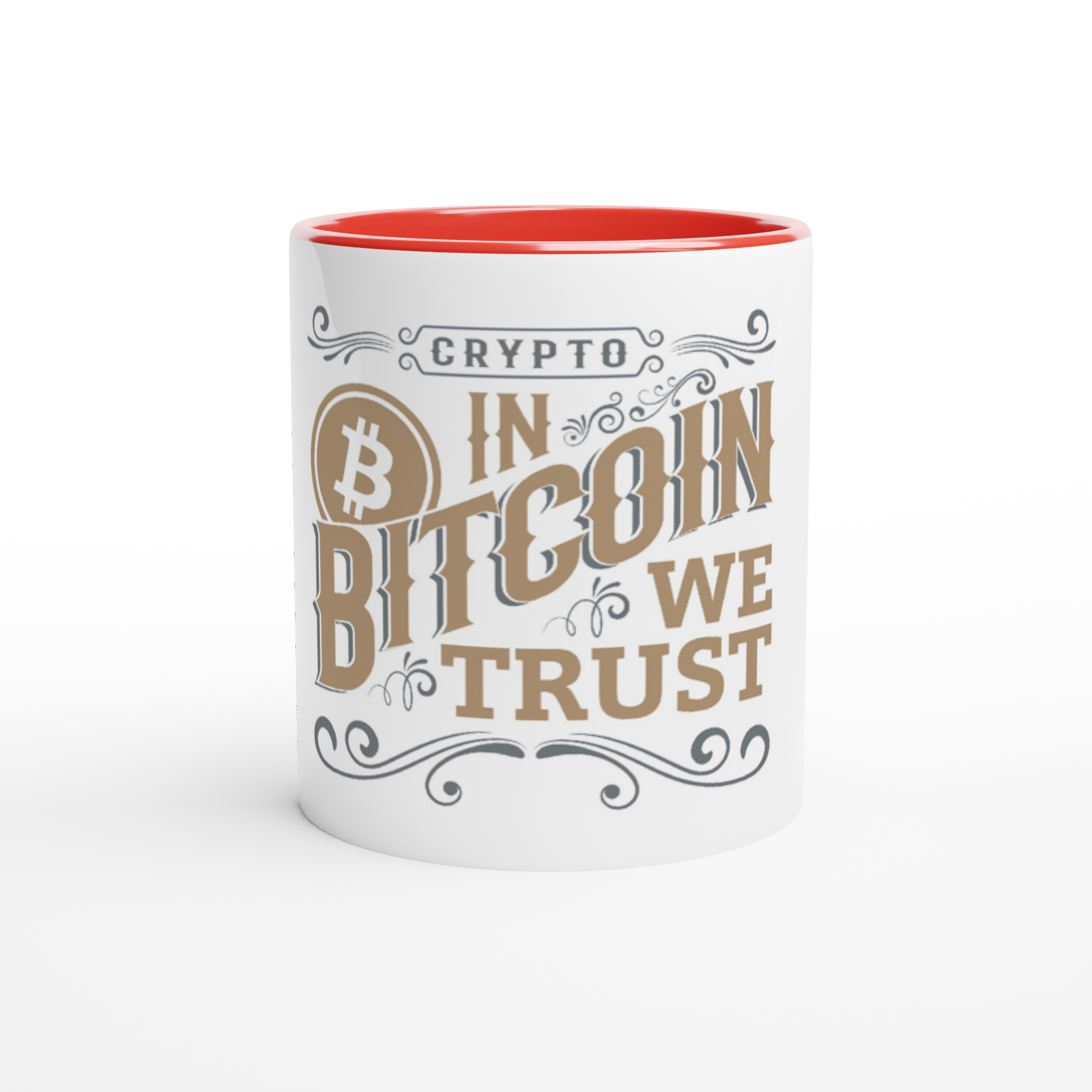 Bitcoin fan, get your hands on this uniquely designed ceramic mug (not really made of crypto, you know), specially created for you, Bitcoin fan. Show off your crypto love with the lettering “In Bitcoin We Trust” printed in a fun and informal way, adding serious personality to your coffee table or desk setup. Choose from several colors for the inside of the cup and make it even more personalized! Enjoy your hot or cold drinks (depending on the market conditions) with this stylish Bitcoin Mug. For you, or as a gift, a perfect liquid (not staking) holder for bitcoin lovers.